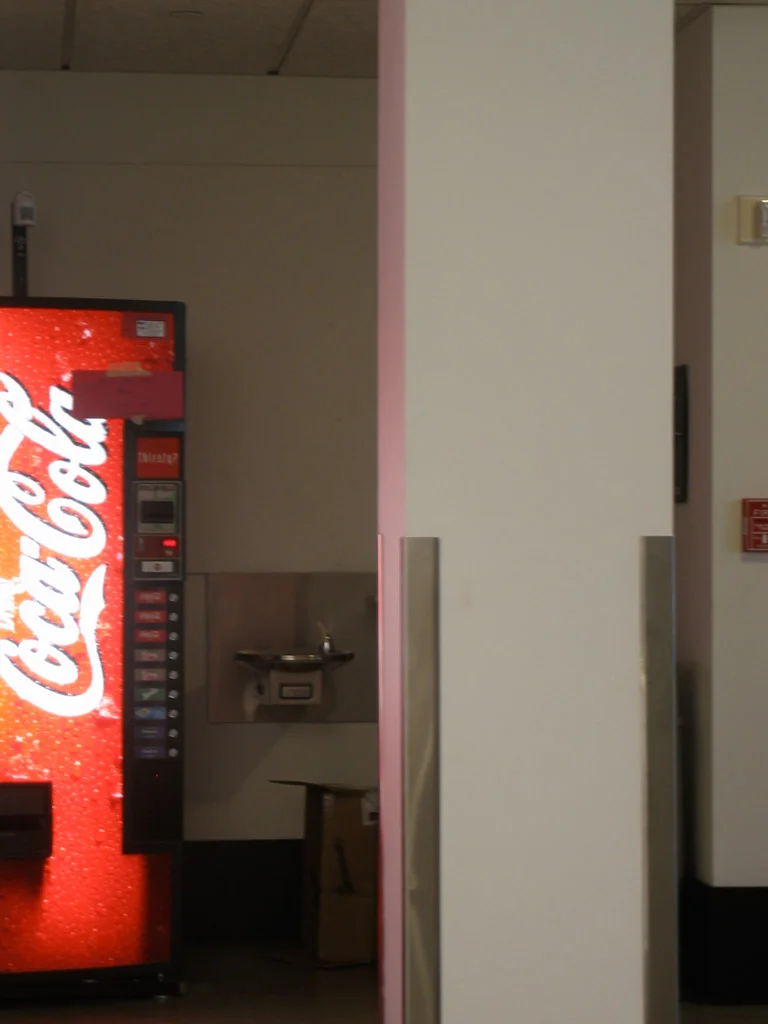 Pink Column. One side of a column appears pink in the red glow from a nearby vending machine; a second side is painted to match this color.