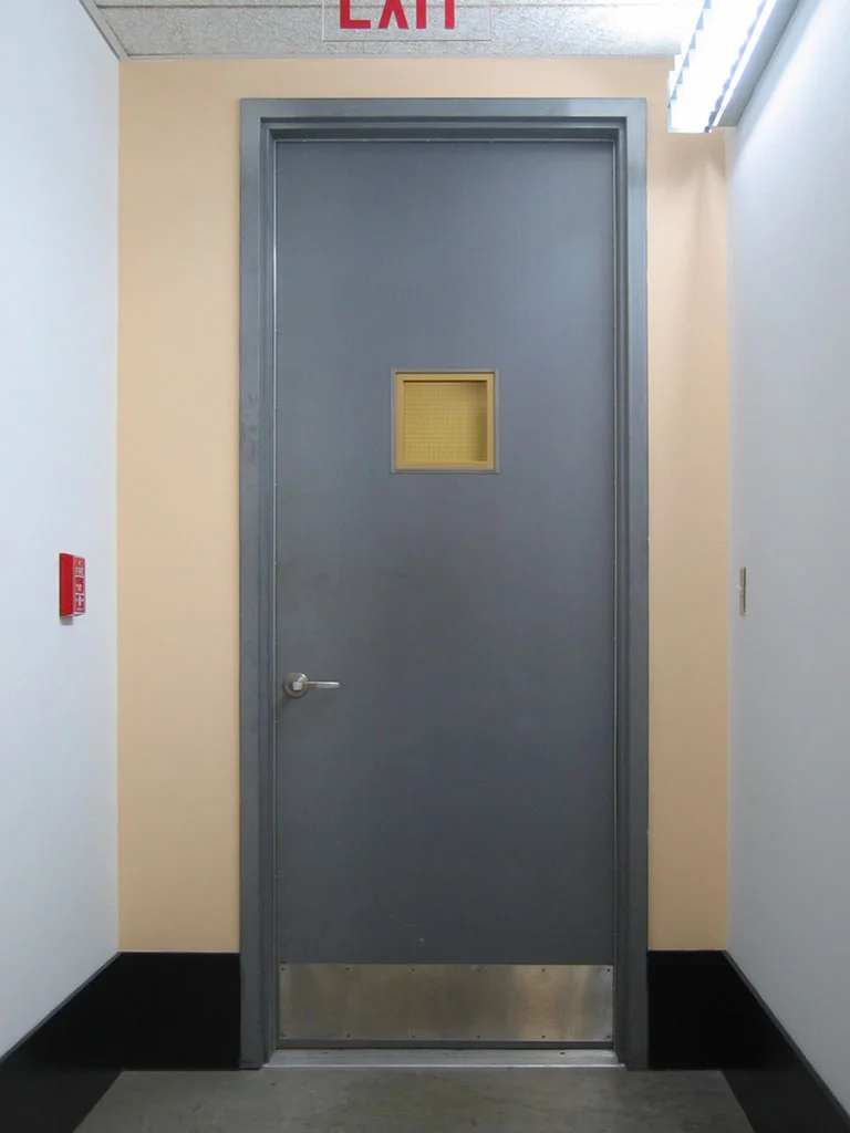 Warm Doorway. The end wall of a hallway is painted orange to match the dominant warm color of the hallway. The effect is imperceptible from the far end of the hall but unmistakable up close. The rim of the door window has also been painted yellow to match the warmly-lit white wall beyond.