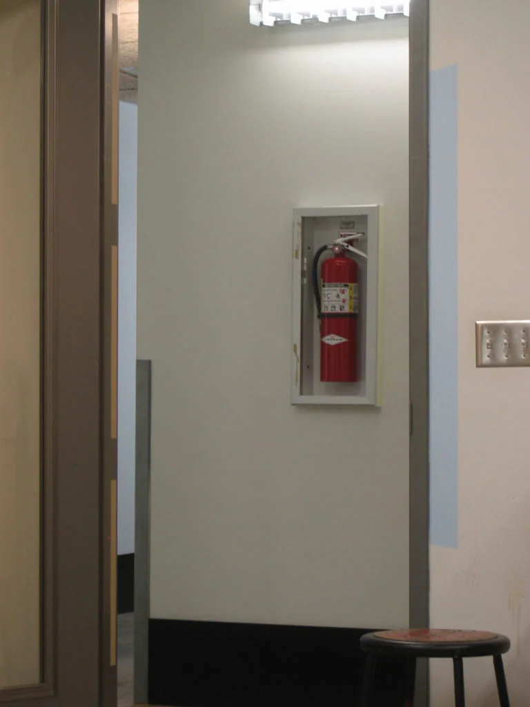 Continuing a line of experimentation with light and surface colors I began in Cheshire, I began to paint segments of the corridor walls. I carefully mixed flat interior latex colors to match the appearance of one of the nearby “white” walls as it appeared in the light of the space. I’d choose, for example, an external corner where two hallways intersected and paint one side of the corner to match the apparent color of the other. These paintings are difficult to convey in photographs, unfortunately, since they played upon an immersed experience of the shifting colors of ambient light as one moved through the building. In situ, however, the paintings were easy to grasp, though not always easy to spot. Camouflaged as they were, they typically went unnoticed at first until someone happened to notice, say, a seam above a doorway where the colored paint ended and the truly white paint continued. From there, word of mouth helped spread awareness of the existence of these pieces throughout the building.